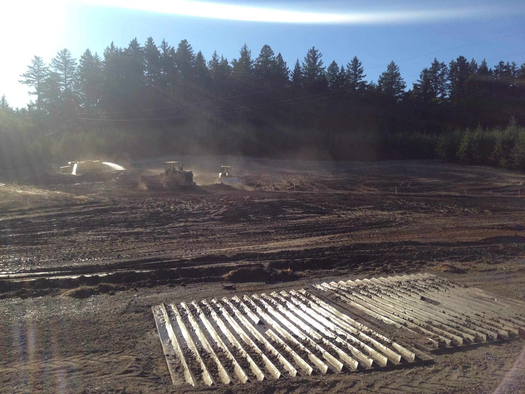 As of last week, the site has been completely cleared. Now the construction crews have begun the grading process by working water into the silty soil.